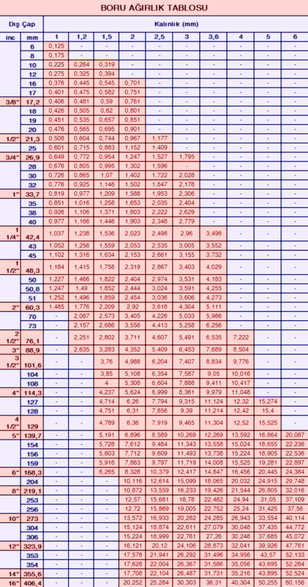 Boru Ağırlık Tablosu