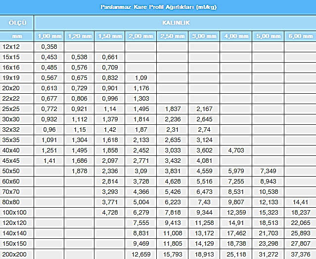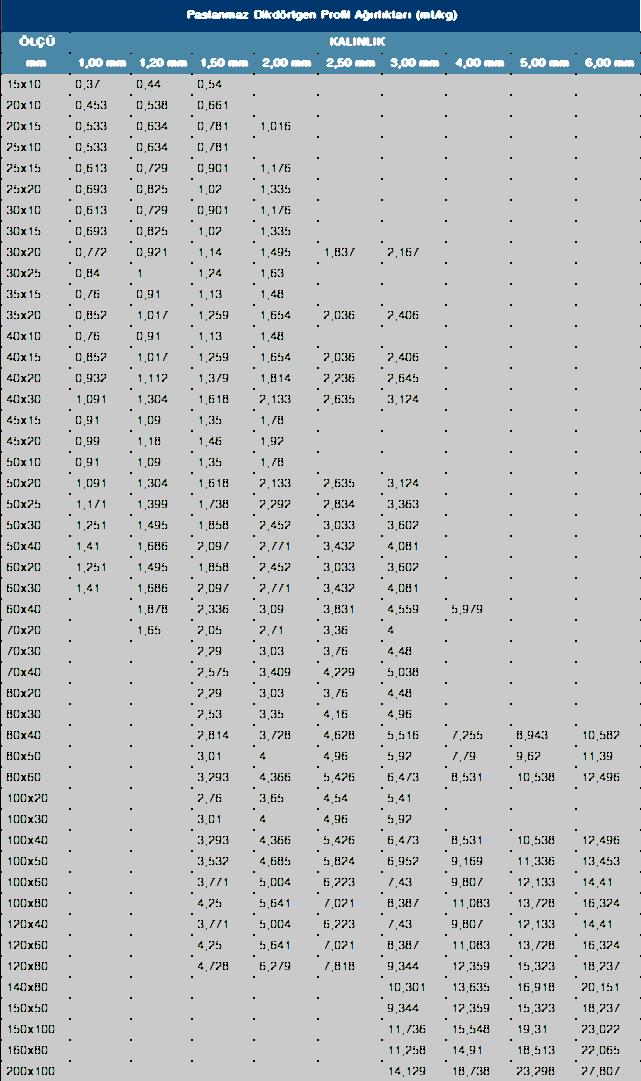 Paslanmaz Profil Ağırlık Tablosu