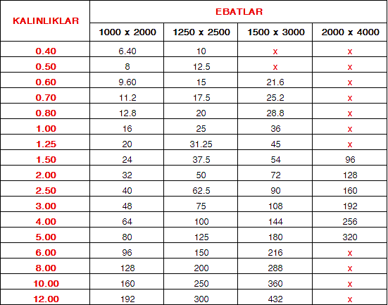 Östenitik AISI 304 304L 316 316Ti, Ferretik AISI 430, Martensitik AISI 309 309S 310 310S standart kalite, 2B mat, BA parlak, SB scoth brite, 4N ince taşlı, 3N kalın taşlı, D1 deri desen, D2 nokta desen, D3 düz kare, D4 çapraz kare yüzey, 0.30mm ile 50mm arasında kalınlık, 1000 x 2000mm, 1250 x 2500mm, 1500 x 3000mm, 1500 x 6000mm, 2000 x 4000mm, 2000 x 6000mm arasında plaka ebatına sahip ürünleri müşteri ihtiyaçlarımıza göre tedarik etmekteyiz.
